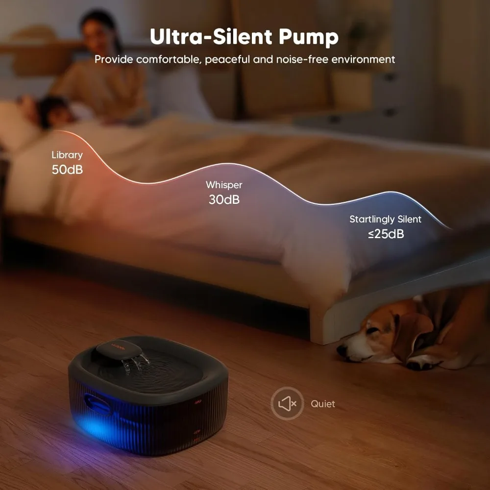 - 【All BPA-Free Material & Safe Smart Pump】All parts of this pet water dispenser are made of high-quality food-grade ABS resin, BPA-free, healthy, hygienic, durable, and easy to clean. The pump is ultra-quiet ( below 30dB) and has low energy consumption + an anti-dry burning design, which gives your pets 100% drinking safety.